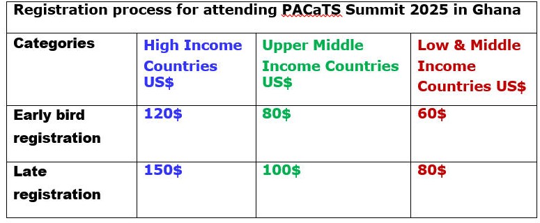 Late Registration Fees: Participants who register and pay online in USD or Ghana Cedis after 15th January 2025 are entitled for late registration fees. 150$, 100$, 80$ (see table below)